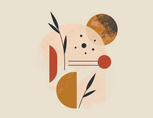 Plakat z serii boho zatytułowany Przyrost do Tła.Plakat przedstawia abstrakcyjną kompozycję złożoną z prostych, geometrycznych form i roślinnych motywów. Dominują tutaj ciepłe odcienie pomarańczowego, różu i brązu, które mieszają się z czernią i beżem. Na pierwszym planie mamy elementy roślinne, które mogą przypominać liście lub gałązki, zaś w tle znajdują się różnej wielkości i faktury koła. Całość jest stylizowana i uproszczona, co daje efekt współczesnego, designerskiego dzieła sztuki. Obraz może inspirować poczuciem spokoju i natury, jednocześnie zachowując modernistyczne uczucie. Idealnie wpasuje się w nowoczesne wnętrze jako centralny punkt dekoracyjny lub delikatne uzupełnienie estetyczne.