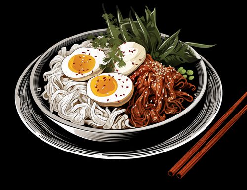 Plakat z serii wnętrza zatytułowany Ramen w Sztuce. Ta apetyczna ilustracja przedstawia klasyczną miskę ramenu, w której harmonijnie komponują się ułożone białe nudle, soczyste półmiski jajka, pikantne kiełki i świeże zielone warzywa, wszystko oprawione w wyraziste akcenty sosu i przypraw. Intensywne kolory i precyzyjne detale rysunku, od czerwonych pałeczek po lśniące składniki, celebrują estetykę i smak tradycyjnego japońskiego dania. Plakat ten wniesie do każdej przestrzeni, od kuchni po jadalnie, ducha nowoczesnego designu i miłości do kulinarnych przyjemności.