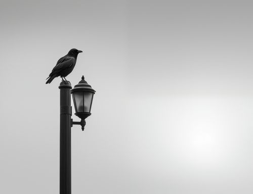 Obraz z serii wnętrza zatytułowany Samotny Postój Kruka. Prezentuje on sylwetkę kruka spoczywającego na klasycznej latarni ulicznej, uchwyconą w monochromatycznej palecie szarości. Ten spokojny, lecz sugestywny plakat jest symbolem refleksji i tajemnicy, doskonale wpisując się w klimat współczesnych przestrzeni miejskich. Praca ta z pewnością stanie się wyrazistym dodatkiem do nowoczesnych wnętrz, takich jak lofty czy minimalistyczne salony, a także wniesie element zastanowienia do przestrzeni publicznych takich jak galerie, kawiarnie i biblioteki, gdzie odosobnienie miesza się z miejskim zgiełkiem.
