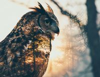 Plakat z serii natura zatytułowany Sowi Duch. Prezentuje on majestatyczną sylwetkę sowy zlewaną z tłem o zachodzie słońca w lesie, co podkreśla jej dziką naturę i instynktowną mądrość. Ciepłe odcienie zachodzącego słońca i sylwetki drzew przenikają się z delikatnym konturem sowy, tworząc wrażenie jedności z naturą. Plakat ten idealnie wpasuje się w przestrzenie takie jak gabinet, biblioteka lub salon, gdzie może inspirować do refleksji i spokoju, przypominając o głębokich, nieodkrytych aspektach natury.