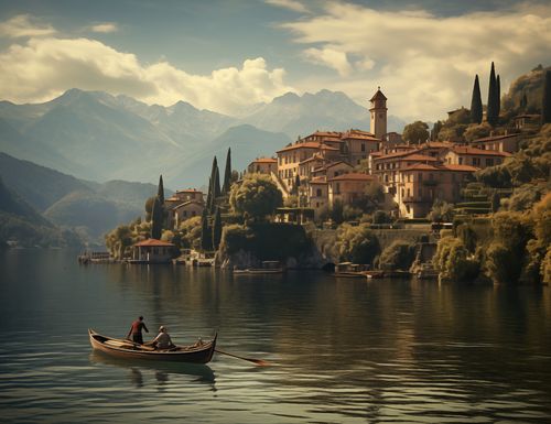 Plakat z serii pejzaże zatytułowany Spokojna Nostalgia, ten urzekający pejzaż przenosi nas do sielankowej wioski nad jeziorem, gdzie czas zdaje się płynąć wolniej. Łagodne światło rozlewające się nad architekturą wioski i gładką powierzchnią wody tworzy poczucie ciepła i spokoju. Para przemieszczająca się łodzią dodaje element ludzki, harmonijnie wpisując się w krajobraz. To dzieło sztuki idealnie nadaje się do przestrzeni, które mają na celu wprowadzenie atmosfery spokoju i refleksji, takich jak biblioteki, poczekalnie lub prywatne gabinety, zapewniając odprężającą ucieczkę od codziennego zgiełku.