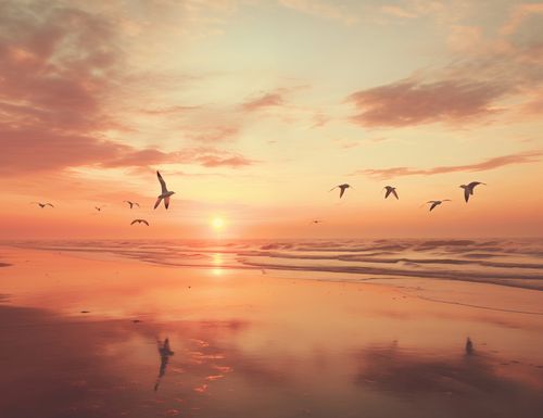Plakat z serii pejzaże zatytułowany Spokojna Przystań przedstawia idylliczny wschód słońca nad morzem, gdzie złociste promienie światła tańczą po delikatnie falującej powierzchni wody. Sylwetki mew unoszących się na ciepłym powietrzu dodają uczucia wolności i bezkresu. Rozmyte odbicia ptaków na mokrym piasku nadmorskim wzbudzają uczucie spokoju i kontemplacji. Ten plakat jest kwintesencją ukojenia, idealny do wnętrz o tematyce nadmorskiej, czy to w prywatnych rezydencjach pragnących złapać oddech od miejskiego zgiełku, jak i w przestrzeniach wellness, spa, czy hotelowych lobby, gdzie głównym celem jest relaks i odprężenie.
