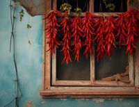 Plakat z serii wnętrza zatytułowany Szczypta Chilli - malowniczy obraz pełen kulturowego bogactwa, przedstawiający bujne kiście czerwonych papryczek chili, suszące się na drewnianej ramie okna. Kontrastujące kolory - żywe czerwienie chili na tle pastelowo-niebieskiej ściany - przyciągają wzrok i oddają esencję wiejskiego życia. Przytulne okno i zardzewiała siatka nadają scenie autentyczny, wiejski charakter, a delikatne odcienie i tekstury ściany dodają głębi i ciepła. Plakat ten jest hołdem dla prostoty i naturalnego piękna codziennego życia, idealnym do wnętrz, które pragną wnieść element tradycyjnego rzemiosła i natury.