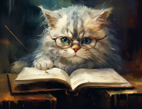 Plakat z serii abstrakcja zatytułowany Ucz Się Ucz. Plakat prezentuje uroczego, puszystego kota rasy perskiej, który z zadumą spogląda przez okulary w stylu vintage, przypominające okulary profesora. Kot wydaje się być zanurzony w lekturze otwartej książki, której strony delikatnie dotyka łapą. Całość jest utrzymana w ciepłej, złotej kolorystyce, co nadaje scenie przytulny, kameralny nastrój. Plakat ma charakter impresjonistyczny, z widocznymi pociągnięciami pędzla, które dodają dynamizmu i tekstury. Ten plakat idealnie wpasowałby się w atmosferę bibliotek, zakątków do czytania, a nawet jako dekoracja w salonach lub gabinetach, dodając wnętrzu intelektualnego charakteru i ciepła.