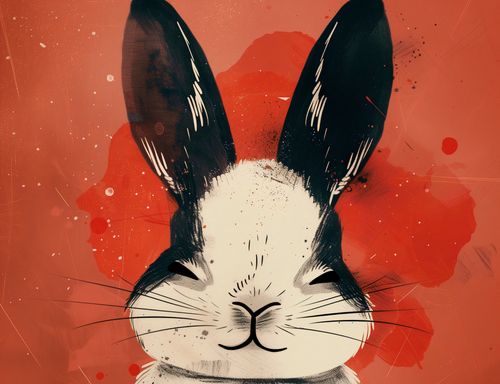 Plakat z serii abstrakcja zatytułowany Uśmiech! przedstawia wizerunek królika w stylistyce inspirowanej street art'em. Tło w ciepłej, czerwonej kolorystyce jest pokryte energicznymi plamami i rozpryskami farby, nadając dynamizmu całości kompozycji. Królik jest przedstawiony frontowo, z głową skierowaną prosto na widza. Jego uszy są wyraziste, czarne z białymi akcentami, co daje efekt trójwymiarowości. Urocza twarz zwierzęcia z subtelnym uśmiechem i charakterystycznymi wąsami wydaje się emanować spokojem i ciepłem. Detale takie jak tekstura futra królika są zaznaczone delikatnymi liniami i cieniowaniem, co dodaje realizmu i głębi grafice. Plakat ten sprawdziłby się jako dekoracja w przestrzeniach współczesnych, które cenią sobie oryginalność i lekkość wizualną, a jednocześnie wprowadza przytulny, domowy nastrój.