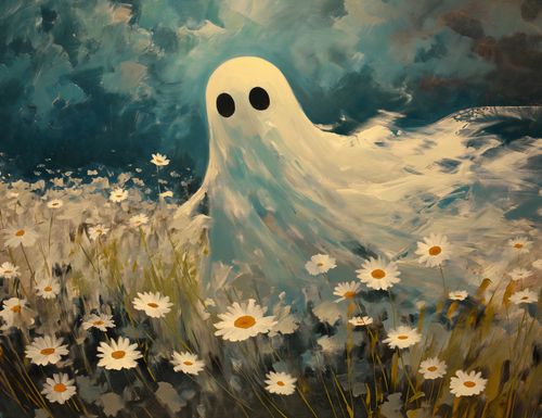 Plakat z serii abstrakcja zatytułowany Widmo Dawnej Łąki.Plakat przedstawia sympatyczną, uproszczoną postać ducha unoszącego się nad łąką pełną białych stokrotek. Duch ma duże, okrągłe oczy, co nadaje mu przyjazny wygląd. Tło to dynamicznie namalowane pociągnięcia pędzlem w odcieniach niebieskiego i brązu, co sprawia wrażenie burzowego nieba lub wschodzącej burzy. Postać ducha kontrastuje z ciemniejszym tłem, a jasne, żywe kolory kwiatów dodają kompozycji ciepła i lekkości. To połączenie elementów może symbolizować nadzieję i pokój w obliczu przeciwności, nadając plakatowi głębsze znaczenie. Idealny do dekoracji wnętrz dla osób ceniących sobie odrobinę humoru i optymizmu.