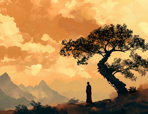 Plakat z serii motywy wschodnie zatytułowany Zen. Plakat przedstawia malowniczy krajobraz w ciepłych odcieniach pomarańczy i brązu, sugerujący scenerię o zachodzie słońca. Centralny punkt obrazu to sylwetka krętego drzewa z gęstym, czarnym liśćmi, wyróżniającego się na tle zachmurzonego nieba. U jego podnóża stoi samotna postać ludzka, która wydaje się rozważać lub podziwiać otaczający ją pejzaż. W oddali majaczą zarysy górskie, co dodaje głębi i tajemniczości kompozycji. Całość tworzy atmosferę spokoju, refleksji i połączenia z naturą. Świetnie sprawdzi się w pomieszczeniach o tematyce orientalnej jak i salonach psychologicznych.