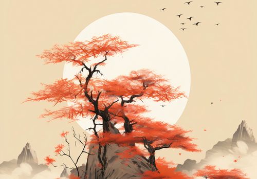 Plakat z serii pejzaże zatytułowany Szepty Wiatru. Niesamowity krajobraz z jaskrawo czerwonymi drzewami rosnącymi na majestatycznej skale, której kształty wydają się być ukształtowane przez wieki. Błyszczący biały księżyc oświetla spokojne wody, które otaczają skale, podczas gdy stado ptaków przenika przez jasne niebo, dodając uczucie przestrzeni i nieskończoności. Subtelne odcienie szarości i biele w tle tworzą kontrast dla wyrazistych czerwieni drzew, nadając scenie głębię i dramatyzm. Idealny do ozdoby salonów medytacyjnych, gabinetów terapeutycznych lub luksusowych hotelowych holów.