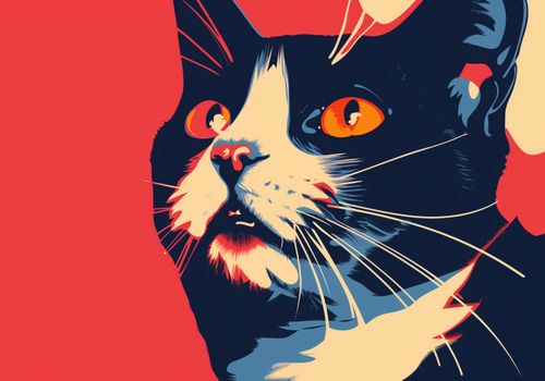 Plakat z serii abstrakcja zatytułowany Szok. Plakat przedstawia zbliżenie na twarz kota w stylizowanej, graficznej formie. Przeważającym kolorem jest intensywny czerwony, który stanowi tło dla sylwetki kota. Wyraziste, żółte oczy zwierzęcia przyciągają uwagę, a ich niemal hipnotyzujący wzrok jest skierowany ku widzowi. Wizerunek kota jest zróżnicowany kolorystycznie: od ciemnych odcieni, poprzez szarości, aż po żywe akcenty błękitu i pomarańczy, które dodają dynamiki i głębi. Detale takie jak wąsy i futro są wyraźnie zaznaczone białymi i niebieskimi liniami, co nadaje ilustracji ruch i teksturę. Całość kompozycji ma współczesny, prawie popartowy charakter, przyciągając wzrok i wzbudzając emocje. Jest to dzieło, które mogłoby znaleźć miejsce w nowoczesnych przestrzeniach, podkreślając miłość do zwierząt i sztuki.