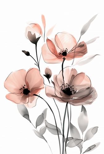 Plakat z serii wnętrza zatytułowany Subtelny Okaz to artystyczna interpretacja delikatnych kwiatów maku. Ilustracja przedstawia kwiaty w pastelowych odcieniach różu i pomarańczy z subtelnymi szarości i akcentami czerni, co nadaje kompozycji miękkiego i eterycznego charakteru. Przezroczyste płatki z lekko zarysowanymi konturami są przedstawione na tle w tonacji jasnego beżu, co pozwala na pełne skupienie na delikatności i pięknie kwiatów. Wykorzystanie minimalizmu i delikatności kolorów sprawia, że plakat emanuje spokojem i elegancją. Idealny do przestrzeni, które cenią sobie spokój i naturę, takich jak salony spa, pokoje gościnne, czy jadalnie, gdzie może dodać odrobinę subtelnego uroku i świeżości.