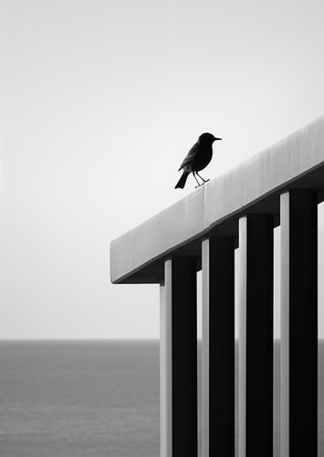 Plakat z serii pejzaże zatytułowany Samotna Odchłań. Ten skrajnie minimalistyczny obraz przedstawia pojedynczego ptaka spoczywającego na czystej, białej krawędzi konstrukcji, z subtelnym tłem nieskończonego morza. Zdjęcie w skali szarości, gdzie tylko kontury ptaka wyróżniają się na jednolitym tle, wywołuje poczucie spokoju i introspekcji. Idealny dla nowoczesnych przestrzeni biurowych i domowych, które pragną oddać hołd prostocie i skupieniu, a także jako przemyślany akcent w galeriach sztuki czy minimalistycznych salonach.