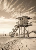 Plakat z serii pejzaże zatytułowany Strażnik Wydm. Prezentuje on sepiową scenę z wieżą ratownika na pustej plaży. Nostalgiczna tonacja obrazu podkreśla samotność struktury i piękno otaczającej ją dzikiej przyrody. Dramatyczne chmury na niebie i ślady na piasku prowadzą wzrok ku wieży, dodając głębi i historii miejscu. Ten plakat idealnie nadaje się do wnętrz, w których pragnie się wywołać uczucie spokoju, przestrzeni i czasów minionych, takich jak salony, pokoje wypoczynkowe, a także przestrzenie publiczne lub prywatne biura, które cenią sobie klasyczny wygląd i atmosferę.