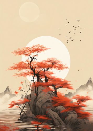 Plakat z serii pejzaże zatytułowany Szepty Wiatru. Niesamowity krajobraz z jaskrawo czerwonymi drzewami rosnącymi na majestatycznej skale, której kształty wydają się być ukształtowane przez wieki. Błyszczący biały księżyc oświetla spokojne wody, które otaczają skale, podczas gdy stado ptaków przenika przez jasne niebo, dodając uczucie przestrzeni i nieskończoności. Subtelne odcienie szarości i biele w tle tworzą kontrast dla wyrazistych czerwieni drzew, nadając scenie głębię i dramatyzm. Idealny do ozdoby salonów medytacyjnych, gabinetów terapeutycznych lub luksusowych hotelowych holów.