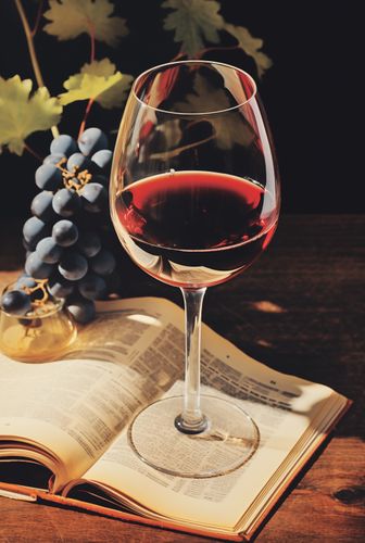 Plakat z serii wnętrza zatytułowany Bukiet Historii. Na tej zachęcającej ilustracji widzimy kieliszek czerwonego wina delikatnie spoczywający na otwartej stronie książki, z wyraźnym odbiciem na stronach. Obok kieliszka umieszczono grono dojrzałych winogron, a całość kompozycji znajduje się na ciemnym tle, co podkreśla bogactwo i głębię barw. Ten plakat oddaje przyjemność płynącą z połączenia relaksującej lektury z degustacją wybornego wina, idealny dla miłośników dobrych książek i enologii, świetnie sprawdzi się w domowych biblioteczkach, salonach degustacyjnych czy jako wyrafinowana dekoracja w winiarniach.