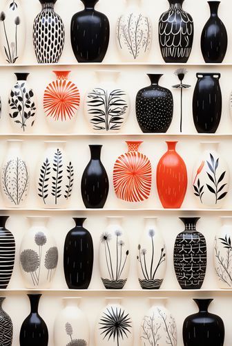 Plakat z serii wnętrza zatytułowany Gliniana Harmonia. Precyzyjnie ułożone wazony na półkach prezentują się niczym w muzeum sztuki użytkowej. Ich geometryczne i roślinne wzory, oscylujące między czernią, bielą i czerwienią, tworzą hipnotyzującą kompozycję. Prostota i elegancja tych przedmiotów, w połączeniu z ich zróżnicowaną fakturą i wzornictwem, dodają wnętrzom niepowtarzalnego charakteru. Idealnie komponują się zarówno w nowoczesnych loftach, jak i tradycyjnych pokojach kolekcjonera. Ta estetyczna kolekcja doskonale odda atmosferę w galeriach designu oraz w ekskluzywnych salonach z antykami.