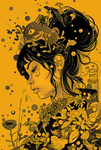 Plakat z serii motywy wschodnie zatytułowany Jedność prezentuje profil portretu młodej kobiety, którego kontury i przestrzeń wokół są wypełnione bogatym, złożonym motywem fauny i flory. Czarno-złota kolorystyka na tle w odcieniach musztardowego żółtego tworzy głęboki kontrast, który przyciąga wzrok i zmusza do refleksji. Włosy kobiety przechodzą w gęstą dżunglę roślin i zwierząt, symbolizując jedność z przyrodą. Wizualnie wyraziste i symbolicznie nasycone, dzieło artystyczne wydaje się idealne do wystroju nowoczesnych przestrzeni mieszkalnych lub miejsc publicznych, które chcą podkreślić związek z naturą i sztuką. Może być również doskonałym dodatkiem do galerii lub przestrzeni artystycznych, które cenią sobie oryginalność i głębię wizualną.
