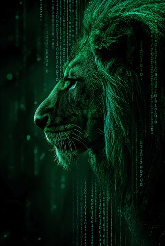 Plakat z serii pop art zatytułowany Kod Siły. Prezentuje majestatyczne oblicze lwa zanurzone w cyfrowym kodzie, który spływa w dół jak deszcz binarny, łącząc siłę i surowość natury z precyzją i logiką technologii. Zielonkawe światło podkreśla kontury i muskulaturę króla zwierząt, a cyfrowe elementy otulają jego profil, sugerując połączenie organicznego i syntetycznego świata. Ten plakat idealnie wpisuje się w nowoczesne, technologiczne przestrzenie, takie jak nowoczesne biura, pokoje gamingowe lub innowacyjne przestrzenie edukacyjne, oferując inspirację i refleksję nad współczesnym związkiem człowieka z technologią.