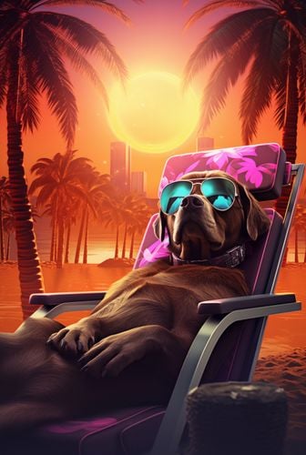 Plakat z serii pop art zatytułowany Lato w Stylu. Na tej zabawnej ilustracji widzimy psa rasy labrador, wygodnie ułożonego na leżaku plażowym, w okularach przeciwsłonecznych, z tłem zachodzącego słońca i palm. Jego relaksująca poza i luźny styl, w połączeniu z żywymi kolorami tropikalnego wschodu lub zachodu słońca, oddają atmosferę beztroskich wakacji. Plakat ten jest idealnym wyborem dla miłośników psów i letnich klimatów, świetnie nadaje się do dekoracji ścian w domach, hotelach nad morzem, czy jako dodatek do letnich barów i restauracji, wprowadzając element humoru i wakacyjnego luzu.