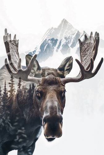 Plakat z serii natura zatytułowany Łoś Duch Lasu to majestatyczne przedstawienie łosia, którego potężne poroże przeobraża się w górski krajobraz. Na pierwszym planie widzimy głęboki, przenikliwy wzrok łosia, skupionego na widzu, z pięknymi, szczegółowo odwzorowanymi detalami sierści. Jego rozłożyste poroże płynnie przeistacza się w ośnieżone szczyty, co symbolizuje jego władzę i jedność z dziką przyrodą. Jasne, lekko zamglone tło sugeruje poranne światło, dodając plakatowi poczucia tajemnicy i dzikiego piękna. Ten plakat doskonale sprawdzi się w przestrzeniach inspirowanych naturą, takich jak chaty górskie, domy myśliwskie, lub jako wyraz głębokiego szacunku dla dzikiej przyrody w salonach i przestrzeniach wspólnych miłośników natury.