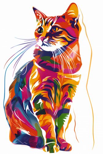 Plakat z serii abstrakcja zatytułowany Nasycony Kot prezentuje kota w stylu pop art, którego futro jest kolażem żywych i nasyconych kolorów, tworząc wizualnie hipnotyzujący efekt. Wzrok kota, z głębokimi i bystrymi oczami, wydaje się śledzić coś poza ramą obrazu, dodając tajemniczości i życia tej grafice. Ekspresyjne linie i kształty, które definiują postać, są odważne i dynamiczne, co podkreśla niezależny charakter zwierzęcia. Ta energetyczna i barwna ilustracja przyciąga wzrok i jest doskonałym dodatkiem do nowoczesnych przestrzeni, które chcą dodać odrobiny kreatywności i koloru, idealna do salonów, studiów artystycznych lub pokoi młodzieżowych.