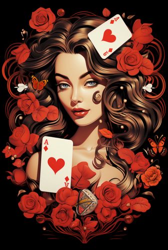 Plakat z serii abstrakcja zatytułowany Różany Hazard. Ta bogato zdobiona grafika przedstawia portret kobiety z królewskim spokojem, otoczoną przez wirujące karty z sercami i rozkwitające czerwone róże. Jej włosy płynnie przechodzą w kwiatowe motywy, a spojrzenie jest pełne tajemnicy i uroku. Motyle i drobne perełki dodają kompozycji element fantazji i delikatności. Wszystko to na tle głębokiej czerni, która eksponuje intensywność kolorów i detali. Plakat ten jest idealny dla przestrzeni, które chcą dodać element romantyzmu i wyrafinowania, jak eleganckie sypialnie, prywatne kolekcje czy luksusowe salony. Jego barwna paleta i symboliczne elementy sprawiają, że jest to dzieło, które przyciąga wzrok i pobudza wyobraźnię.