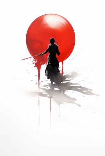 Plakat z serii motywy wschodnie zatytułowany Samotny Samuraj przedstawia postać w tradycyjnym japońskim stroju, samuraja, w dynamicznej pozie z mieczem, z potężnym, czerwonym słońcem w tle. Design wykorzystuje silne kontrasty kolorystyczne - biel i czerń z akcentami czerwieni, aby stworzyć dramatyczną i potężną wizualizację. Przedstawienie samuraja w akcji z rozpryskami tuszu naokoło podkreśla ruch i energię, a jednocześnie oddaje hołd tradycyjnym technikom japońskiego malarstwa atramentem. Ten plakat to doskonały wybór dla miłośników japońskiej kultury i sztuk walki, idealny do wnętrz nowoczesnych jak i tych o bardziej klasycznym charakterze.