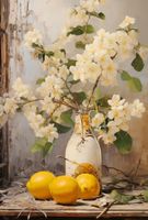 Plakat z serii wnętrza zatytułowany Słodkie Chwile. Delikatne białe kwiaty o subtelnym żółtym środku rozkwitają pełnym blaskiem obok dojrzewających cytryn, które wyróżniają się na tle w delikatnych pastelowych odcieniach. Starannie postarzana butelka i rustykalne drewno dodają nuty nostalgii i spokoju do tej kompozycji. Delikatna gra światła i cienia tworzy głęboką atmosferę i dodaje ciepła do sceny. Świetnie sprawdzi się w kawiarniach o prowansalskim stylu, domowych jadalniach dla tych, którzy pragną dodać do swojej przestrzeni odrobinę wiejskiego uroku, czy też w hotelach, gdzie chce się podkreślić elegancję i ciepło naturalnych elementów.
