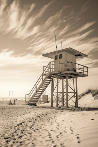 Plakat z serii pejzaże zatytułowany Strażnik Wydm. Prezentuje on sepiową scenę z wieżą ratownika na pustej plaży. Nostalgiczna tonacja obrazu podkreśla samotność struktury i piękno otaczającej ją dzikiej przyrody. Dramatyczne chmury na niebie i ślady na piasku prowadzą wzrok ku wieży, dodając głębi i historii miejscu. Ten plakat idealnie nadaje się do wnętrz, w których pragnie się wywołać uczucie spokoju, przestrzeni i czasów minionych, takich jak salony, pokoje wypoczynkowe, a także przestrzenie publiczne lub prywatne biura, które cenią sobie klasyczny wygląd i atmosferę.