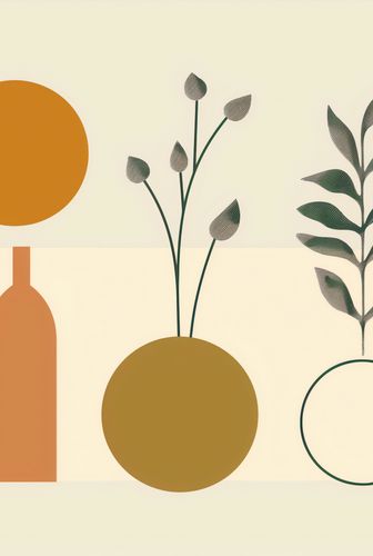 Plakat z serii boho zatytułowany Symfonia Równowagi. Plakat łączy organiczne kształty roślin z rygorystyczną formą geometrii. Prezentuje on wazony w spokojnych odcieniach brązu i złota, z których jeden jest ozdobiony gałązkami z delikatnymi pąkami, a drugi pokazuje symetryczny wzór liści. Proste linie i figury geometryczne, takie jak okrąg i prostokąt, tworzą tło dla roślinności, przypominając o ludzkiej próbie ujarzmienia natury. Całość osadzona na pastelowym tle wywołuje uczucie spokoju i harmonii. To dzieło będzie pasowało do przestrzeni, które cenią równowagę między naturą a stworzonym przez człowieka porządkiem, jak eleganckie gabinety, przestrzenie wellness lub strefy odpoczynku, które dążą do stworzenia oazy spokoju w zabieganym świecie.