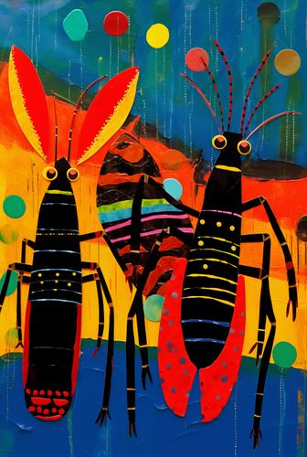 Plakat z serii abstrakcja zatytułowany Taneczne Rytmiki. Ten plakat przedstawia abstrakcyjne, kolorowe krewetki, które zdają się tańczyć na tle żywiołowego, ekspresyjnego tła. Pełen życia i ruchu, z bogatą paletą barw oraz zabawnymi szczegółami, takimi jak kropki i paski, które dodają charakteru tym stylizowanym stworzeniom. Przykuwające uwagę, wesołe i nieco surrealistyczne przedstawienie owadów morskich przynosi do wnętrza poczucie humoru i odrobiny whimsy. To dzieło jest idealnym wyborem dla przestrzeni, które celebrują naturę w sposób niekonwencjonalny i szukają dzieł sztuki, które są zarówno rozmowne, jak i wizualnie pobudzające.