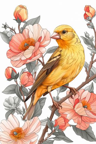 Plakat z serii natura zatytułowany Wiosenny Śpiewaczek przedstawia pełną detali i życia scenę, w której jaskrawo żółty ptak, przypominający kanarka, spoczywa na gałęzi wśród kwitnących kwiatów. Delikatne i subtelne kolory kwiatów w pastelowych odcieniach różu i pomarańczu tworzą miękki kontrast do żywego upierzenia ptaka. Precyzyjne linie i staranne cieniowanie nadają ilustracji realistycznego wyglądu, a roślinność w tle jest równie szczegółowo wykonana, co dodaje kompozycji głębi i bogactwa. Ten plakat to celebracja wiosennego odrodzenia i piękna natury, idealny do ożywienia każdego wnętrza, szczególnie pokoju dziennego, przestrzeni odpoczynkowej lub kawiarni o przytulnej atmosferze.