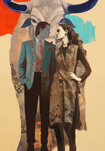 Plakat z serii abstrakcja zatytułowany Dialog Kultur. Ten unikalny plakat przedstawia mężczyznę i kobietę w tradycyjnych strojach, stojących na tle abstrakcyjnego wizerunku byka, który może symbolizować siłę i dziedzictwo kulturalne. Ich ubiory, pełne tekstur i wzorów, w połączeniu z modernistycznym tłem, odzwierciedlają zetknięcie się różnych epok i wartości. Plakat wyraża ideę harmonii pomimo różnorodności, łącząc w sobie elementy historyczne z nowoczesną abstrakcją. Jest to doskonały wybór dla przestrzeni celebrujących różnorodność i bogactwo kulturowe.