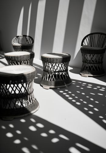 Plakat z serii wnętrza zatytułowany Gra Świateł to stylowa, monochromatyczna fotografia, która oddaje estetykę współczesnego designu. Na fotografii widzimy zestaw eleganckich, plecionych stołków z rattanu ustawionych na tle geometrycznych cieni. Ostre linie cieni przełamują okrągłe kształty mebli, tworząc fascynującą kompozycję pełną kontrastów. Białe siedziska stołków pięknie kontrastują z ciemniejszymi elementami, a gra światła i cienia nadaje scenie trójwymiarowość i teksturę. Plakat ten będzie doskonały dla miłośników minimalistycznych wnętrz, a także dla osób poszukujących elementu dekoracyjnego, który wprowadzi do pomieszczenia nowoczesny i artystyczny akcent. Idealny do nowoczesnych przestrzeni mieszkalnych, biur, kawiarni lub galerii sztuki.