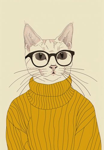 Plakat z serii abstrakcja zatytułowany Intelektualista to urocze przedstawienie kota ubranego w stylowy, żółty golf, dopełnionego okularami w intelektualnym stylu. Ilustracja charakteryzuje się subtelną linią i pastelową kolorystyką, co nadaje jej delikatny i stylowy wygląd. Okulary z grubymi oprawkami nadają kotu wyraz powagi i inteligencji, podczas gdy żółty sweter wskazuje na wyrafinowany gust. Całość kompozycji jest zabawna, ale jednocześnie elegancka, sprawiając, że plakat ten jest idealny dla tych, którzy cenią sobie humor połączony z klasą. Doskonale nadaje się do nowoczesnych przestrzeni mieszkalnych, pokoi młodzieżowych, biur lub jako dekoracja w księgarniach i kawiarniach.