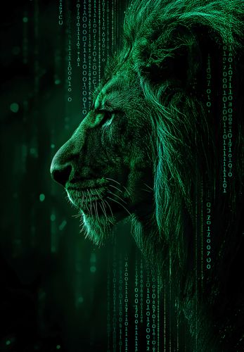 Plakat z serii pop art zatytułowany Kod Siły. Prezentuje majestatyczne oblicze lwa zanurzone w cyfrowym kodzie, który spływa w dół jak deszcz binarny, łącząc siłę i surowość natury z precyzją i logiką technologii. Zielonkawe światło podkreśla kontury i muskulaturę króla zwierząt, a cyfrowe elementy otulają jego profil, sugerując połączenie organicznego i syntetycznego świata. Ten plakat idealnie wpisuje się w nowoczesne, technologiczne przestrzenie, takie jak nowoczesne biura, pokoje gamingowe lub innowacyjne przestrzenie edukacyjne, oferując inspirację i refleksję nad współczesnym związkiem człowieka z technologią.