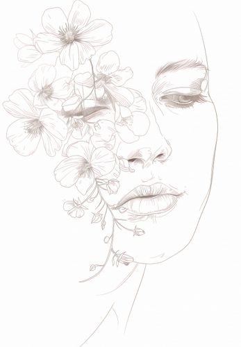 Plakat z serii wnętrza zatytułowany Kwitnąca Imersja przedstawia delikatny, linijny rysunek profilu kobiety, którego twarz częściowo zasłaniają i uzupełniają subtelne kwiaty. Delikatne linie twarzy kobiecej harmonizują z organicznymi kształtami roślin, sugerując jedność z naturą i subtelne piękno. Kwiaty wydają się być naturalnym przedłużeniem jej bytu, dodającym delikatności i eterycznego charakteru całej kompozycji. Ta minimalistyczna, ale wyrafinowana ilustracja emanuje spokojem i ukojeniem, idealna do przestrzeni medytacyjnych, salonów spa, lub jako elegancki element dekoracyjny w nowoczesnych wnętrzach.