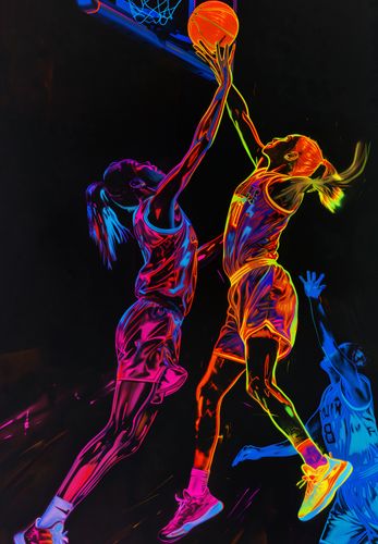 Plakat z serii abstrakcja zatytułowany Mecz W Kosza. Przedstawia żywą i dynamiczną scenę z gry w koszykówkę, w której dwie zawodniczki rywalizują o piłkę. Graczka w pierwszym planie wykonuje skok do kosza w akcie rzutu lub bloku, rozciągając się w pełnej koncentracji, podczas gdy jej przeciwniczka stara się ją zablokować. Figury sportowców są przedstawione w intensywnych, neonowych kolorach, które kontrastują z ciemnym tłem, co nadaje scenie energiczny i ekscytujący charakter. Kolory są rozmieszczone na postaciach w sposób, który podkreśla ich ruch i ekspresję, a także oddaje dynamikę i szybkość sportowej akcji. Plakat ten idealnie oddaje ducha sportowej rywalizacji i mogłby być inspirującym dodatkiem do wnętrza dla miłośników koszykówki i sportu.
