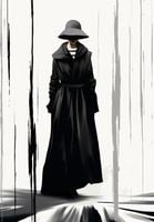 Plakat z serii wnętrza zatytułowany Mroczna Taina. Enigmatyczna postać w czarnym płaszczu i szerokim kapeluszu ukrywa swoją tożsamość, podkreślając aura tajemniczości. Czarno-białe tło z pionowymi smugami przypominającymi deszcz lub płynący atrament dodaje głębi i dramatyzmu kompozycji. Subtelne niuanse światła i cienia grają na powierzchni płaszcza, tworząc atmosferę intrygi i nieokreślonego niebezpieczeństwa. Świetnie sprawdzi się w nowoczesnych galeriach sztuki, luksusowych hotelach o minimalistycznym designie oraz w przestrzeniach przeznaczonych dla miłośników noir i kryminałów.