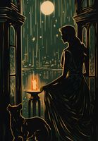 Plakat z serii pejzaże zatytułowany Nocne Szeptanie. Zadziwiająca sylwetka kobiety stojącej na balkonie, skąpana w świetle księżyca, jest podkreślana przez delikatne kontury jej sukni. Obok niej, wierny towarzysz w postaci kota, czuwa nad otoczeniem. Spokojna atmosfera miejskiej nocy na tle zorzy oraz migoczące gwiazdy nadają kompozycji niezwykłego uroku i głębokiej kontemplacji. Świetnie sprawdzi się w cichych kącikach czytelniczych, hotelowych lobby oraz w miejscach dedykowanych relaksowi i medytacji.