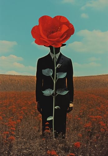 Plakat z serii abstrakcja zatytułowany Obserwator zza Maku. Ten plakat przedstawia surrealistyczny obraz człowieka z głową w formie rozkwitającego czerwonego maku, stojącego na polu pełnym kwiatów tej samej rośliny. Kompozycja gra na kontraście między ludzką postacią a bujnością natury, podkreślając połączenie człowieka z otaczającym go światem. Idealny dla przestrzeni szukających głębi artystycznej i wizualnej prowokacji, ten plakat będzie doskonałym dodatkiem do nowoczesnych salonów, galerii sztuki czy przestrzeni kreatywnych, gdzie może inspirować i wywoływać refleksję.