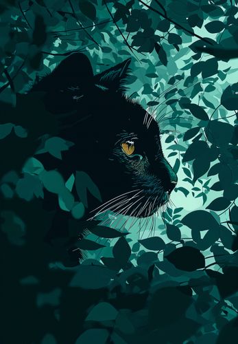 Plakat z serii wnętrza Oczekiwanie, przedstawia portret czarnego kota wtapiającego się w zielone liście. Artysta użył bogatej palety odcieni zieleni, aby stworzyć iluzję kota skrytego w gęstym listowiu, z wyraźnym, żółtym okiem, które przyciąga uwagę i daje wrażenie czujności i tajemniczości. Złożoność wzoru liści kontrastuje z prostotą cienia kota, co nadaje dziełu głębi i wielowymiarowości. Ten plakat byłby idealnym dodatkiem do każdego współczesnego wnętrza, które ceni subtelność i naturę, a także może być interesującym punktem centralnym w galerii sztuki lub przestrzeni wystawienniczej.