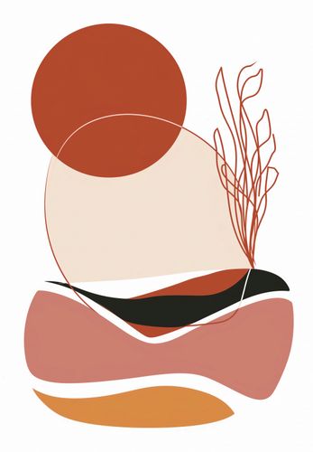 Plakat z serii minimalistyczne zatytułowany Popołudnie. Praca ta zachwyca swoją spokojną i wyważoną kompozycją, w której delikatne linie i kształty tworzą abstrakcyjny krajobraz. Głębokie czerwienie harmonizują z ciepłymi beżami i akcentami pomarańczy, a zarysowane rośliny dodają obrazowi organicznego charakteru. Ten plakat będzie doskonałym dodatkiem do wnętrz, które pragną wprowadzić elementy sztuki współczesnej, jednocześnie zachowując ciepło i przytulność. Doskonale odnajdzie się w salonach, kącikach do odpoczynku, czy też jako wyjątkowy akcent w przestrzeni biurowej. Zapewni każdej przestrzeni uczucie wyciszenia i estetycznej przyjemności.