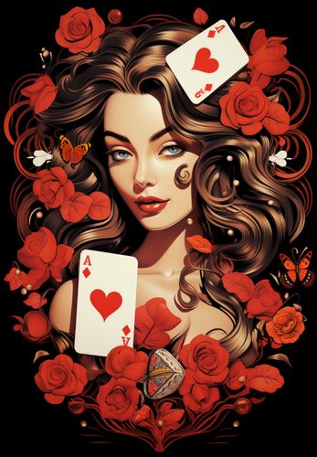 Plakat z serii abstrakcja zatytułowany Różany Hazard. Ta bogato zdobiona grafika przedstawia portret kobiety z królewskim spokojem, otoczoną przez wirujące karty z sercami i rozkwitające czerwone róże. Jej włosy płynnie przechodzą w kwiatowe motywy, a spojrzenie jest pełne tajemnicy i uroku. Motyle i drobne perełki dodają kompozycji element fantazji i delikatności. Wszystko to na tle głębokiej czerni, która eksponuje intensywność kolorów i detali. Plakat ten jest idealny dla przestrzeni, które chcą dodać element romantyzmu i wyrafinowania, jak eleganckie sypialnie, prywatne kolekcje czy luksusowe salony. Jego barwna paleta i symboliczne elementy sprawiają, że jest to dzieło, które przyciąga wzrok i pobudza wyobraźnię.