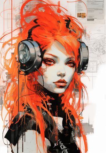 Plakat z serii pop art zatytułowany Rytm Metropolii. Dynamiczna kompozycja łączy portret kobiety o wyrazistych, pomarańczowych włosach z elementami miejskiego krajobrazu. Jej spojrzenie jest intensywne i pełne pasji, zaś duże słuchawki na uszach sugerują miłość do muzyki i rytmu wielkiego miasta. Abstrakcyjne linie i kształty, mieszające się z realistycznie oddaną postacią, tworzą wrażenie ruchu i pulsującej energii. To dzieło sztuki jest idealne dla miłośników muzyki, street artu i nowoczesnego designu, doskonale nadając się do wnętrz loftów, studiów muzycznych czy awangardowych salonów, które pragną podkreślić miejski charakter swojej przestrzeni.