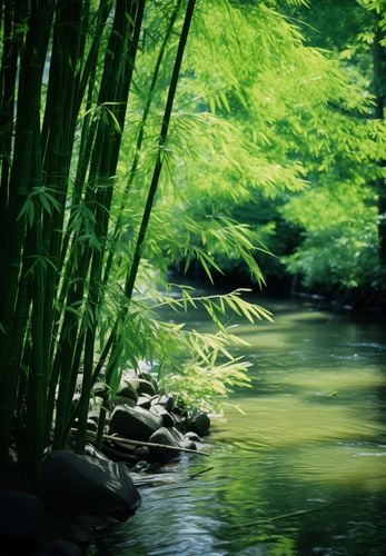 Plakat z serii natura zatytułowany Spokój Bambusów. Ukazuje on idylliczny zakątek przyrody, gdzie zielone pędy bambusa delikatnie zginają się nad błogim, spokojnie płynącym strumieniem. Gra światła i cienia na liściach bambusa tworzy wrażenie głębi i spokoju, zaś szemrząca woda dodaje uczucie świeżości i czystości. Ten plakat oddaje piękno i spokój odosobnionego zakątka natury, jest więc idealny dla przestrzeni relaksacyjnych takich jak spa, pokoje do medytacji lub jako ukojenie w zgiełku codzienności w domowych wnętrzach. To doskonała dekoracja dla tych, którzy pragną wprowadzić element natury i harmonii do swojego otoczenia.