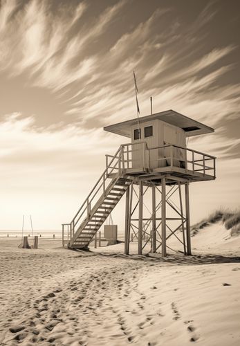 Plakat z serii pejzaże zatytułowany Strażnik Wydm. Prezentuje on sepiową scenę z wieżą ratownika na pustej plaży. Nostalgiczna tonacja obrazu podkreśla samotność struktury i piękno otaczającej ją dzikiej przyrody. Dramatyczne chmury na niebie i ślady na piasku prowadzą wzrok ku wieży, dodając głębi i historii miejscu. Ten plakat idealnie nadaje się do wnętrz, w których pragnie się wywołać uczucie spokoju, przestrzeni i czasów minionych, takich jak salony, pokoje wypoczynkowe, a także przestrzenie publiczne lub prywatne biura, które cenią sobie klasyczny wygląd i atmosferę.