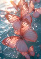 Plakat z serii natura zatytułowany Świetliste Motyle. Na plakacie widzimy delikatne motyle o przezroczystych, różowych skrzydłach, unoszące się nad wodą i łagodnie odbijające światło słoneczne. Kropelki wody na ich skrzydłach dodają uczucia świeżości i czystości. Plakat emanuje spokojem i pięknem, idealnie nadając się do przestrzeni, które chcą wprowadzić element relaksu i spokoju, takich jak spa, pokoje medytacyjne, a także jako łagodny element dekoracyjny do domu.