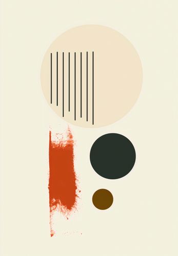 Plakat z serii boho zatytułowany Symetryczna Struna.Grafika przedstawia zrównoważoną kompozycję z surowymi elementami geometrycznymi i organicznym pociągnięciem pędzla. Kremowe tło rozświetla duże koło z rytmicznie rozmieszczonymi pionowymi liniami, które mogą symbolizować struny instrumentu lub elementy urbanistyczne. Intensywne maznięcie koloru w dolnej części obrazu dodaje energii i kontrastu, natomiast umieszczone obok czarne i brązowe kółka wprowadzają wrażenie głębi. Plakat idealnie uzupełni wnętrza w duchu minimalizmu i modernizmu, takie jak stylowe salony, gabinety, czy współczesne przestrzenie biurowe, gdzie może stanowić element kontrastujący z prostotą otoczenia.