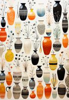 Plakat z serii wnętrza zatytułowany Symfonia Wazonów. Wspaniałe wazony w bogatej palecie kolorów, od głębokiej czerni do ciepłych odcieni pomarańczu, tworzą intrygującą mozaikę wzorów i kształtów. Delikatne motywy roślinne, które zdobią niektóre wazony, dodają uroku i lekkości, a różnorodność wzorów i faktur przyciąga wzrok i zaprasza do głębszej refleksji. Kontrast między jasnymi i ciemnymi barwami, a także subtelne niuanse w każdym wazonie, dodają tej kompozycji głębi i dramatu. Ten artystyczny plakat doskonale wpisuje się w klimat wyrafinowanych galerii sztuki, eleganckich kawiarni oraz nowoczesnych przestrzeni mieszkalnych, które stawiają na unikatowy design.