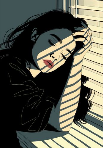 Plakat z serii abstrakcja zatytułowany Zamysł. Plakat przedstawia kobietę z zamyślonym wyrazem twarzy, z głową opartą na dłoni, co sugeruje moment introspekcji lub smutku. Silne cienie i linie świetlne tworzące prążki na jej twarzy dodają głębi kompozycji, a kontrastująca paleta kolorów z dominującymi odcieniami niebieskiego i czerni, podkreślona akcentem czerwieni ust, potęguje emocjonalne napięcie dzieła. Ten plakat może symbolizować skomplikowane emocje ludzkiego doświadczenia i jest idealnym dodatkiem do przestrzeni, które cenią sobie głębię i wyrazistość w sztuce, takich jak salon, studio twórcze, czy miejsce do medytacji.